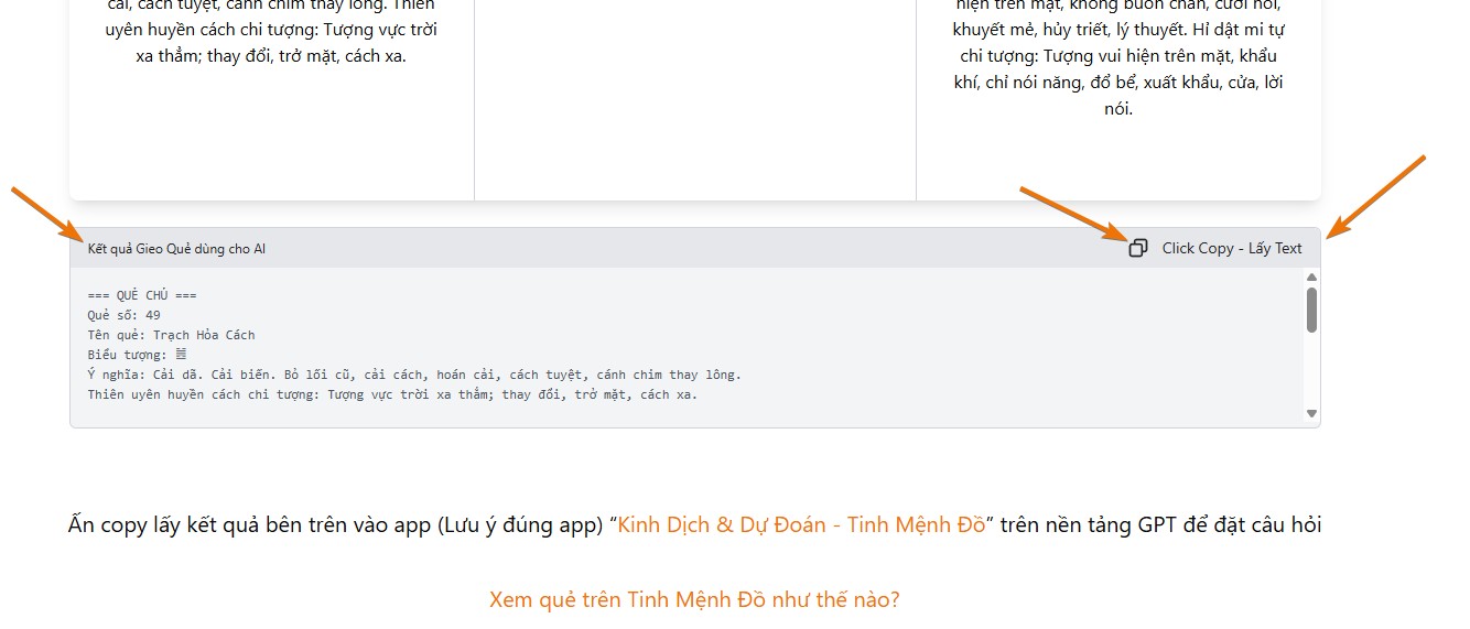 - Sau khi quẻ được tạo kết nối với app Tinh Mệnh Đồ - Kinh Dịch & Dự Đoán trên nền tảng Gemini để phân tích ý nghĩa quẻ, từ cả góc nhìn cổ điển lẫn thực tế ứng dụng trong công việc.